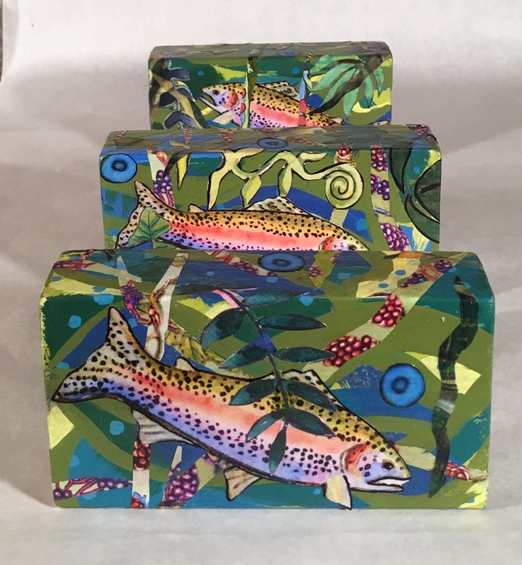 A set of three colorful collage blocks in successive sizes and each with a stylized trout on them. Artwork by Pamela Tripp Simmons.