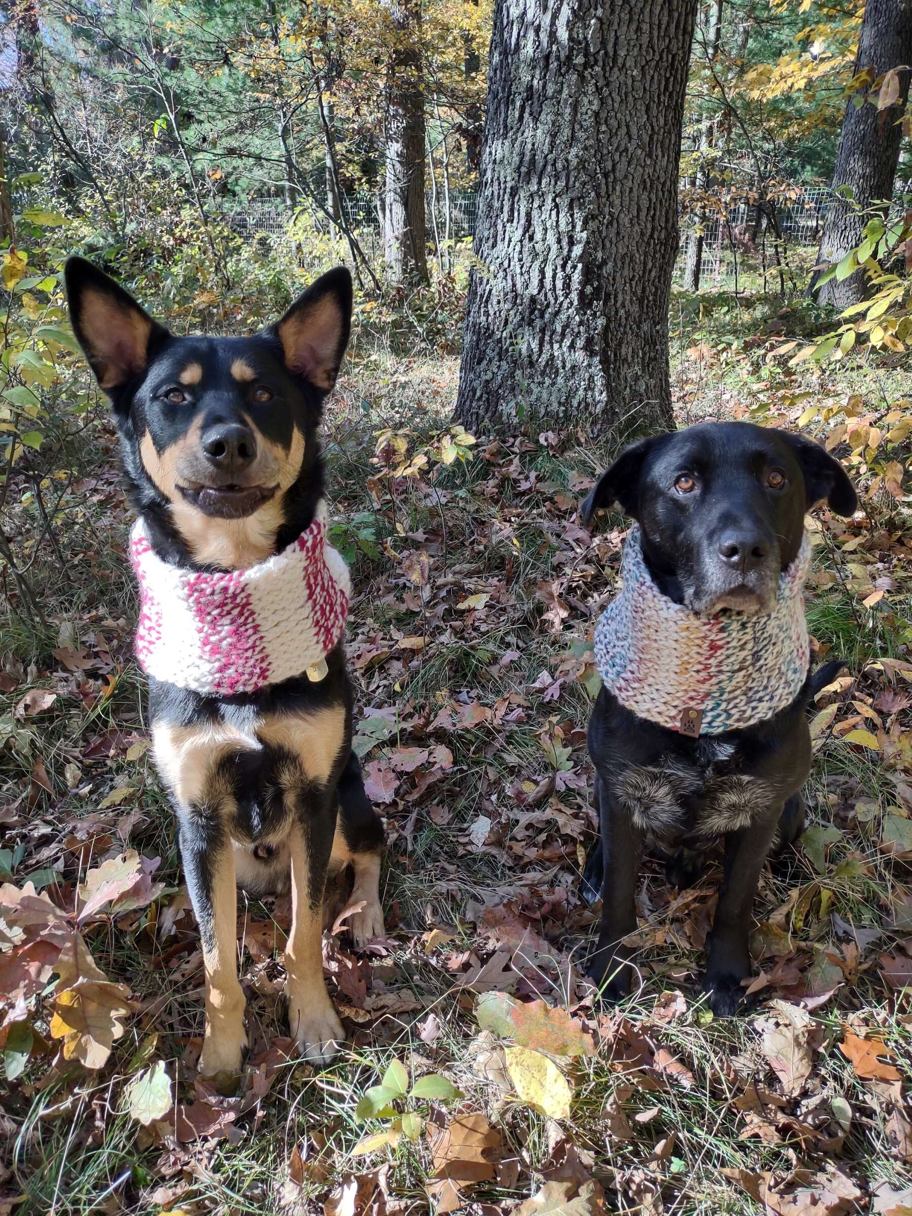 Shannon Courier's German Shepherd and black Labrador model their knitted cowls from Forest Dog's Canine Collection. Courtesy photo.