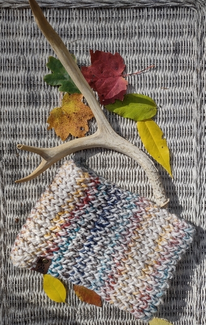 Close-up photograph of one of Forest Dog's cozy knitted cowls beside an antler and various fall leaves. Courtesy photo.