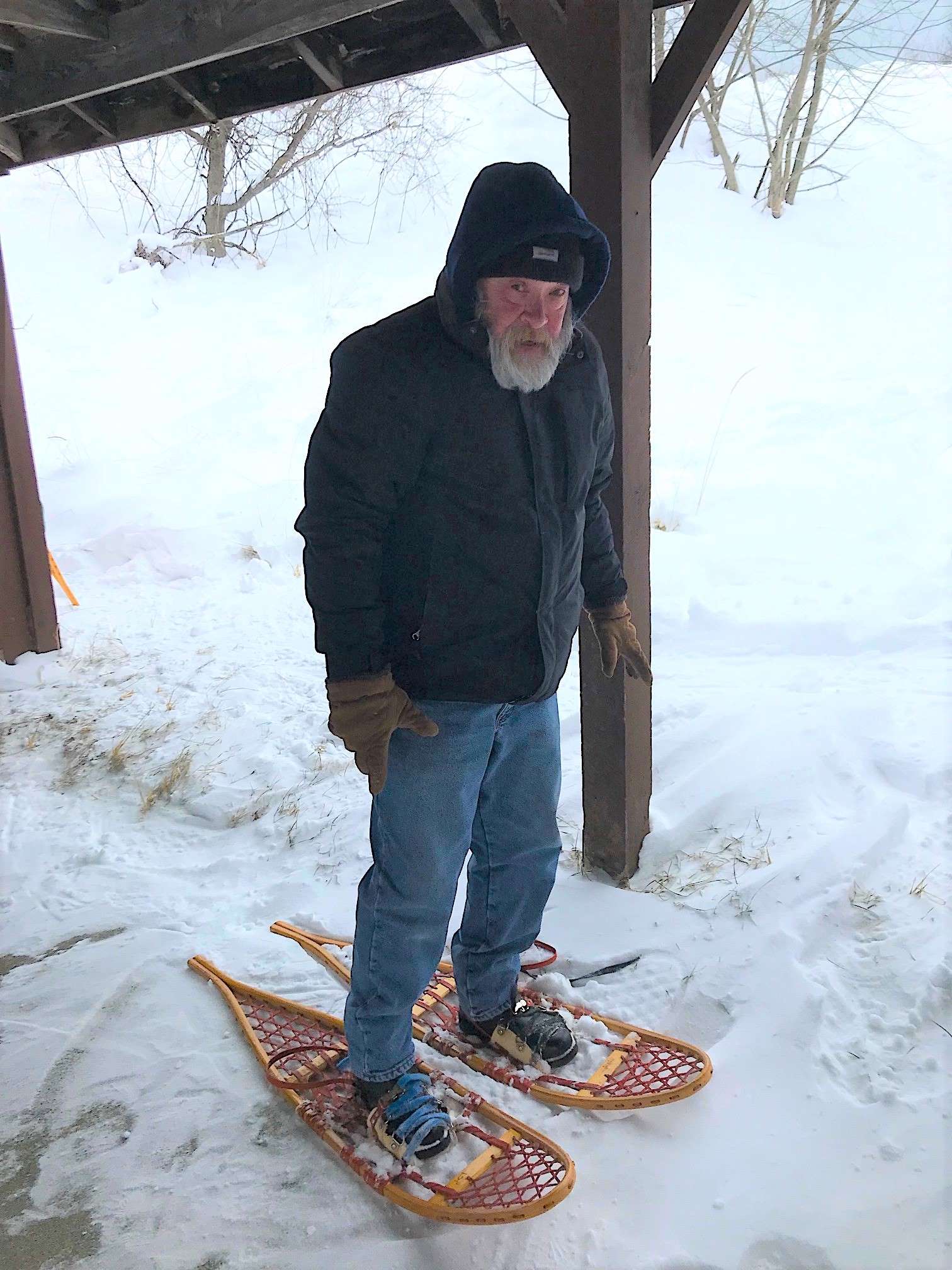 With my snowshoes on and my shoulders hunched in the cold, I'm finally ready to go on the trail, I think. Photo by Jean Howell.